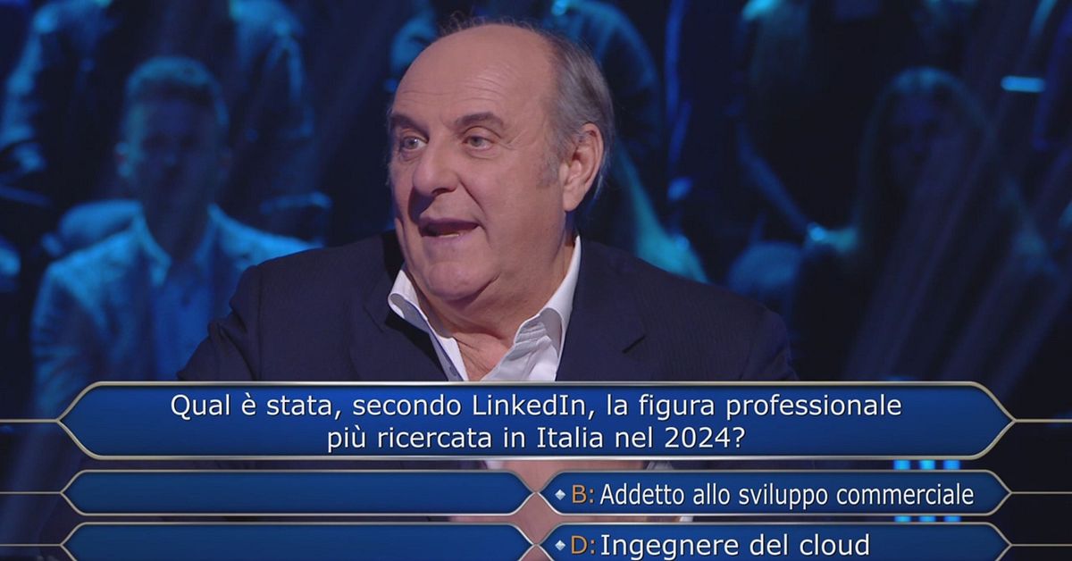 Claudio ha attraversato le domande con passo costante, fino a chiudere la puntata da campione e a portarsi a casa 150 mila euro, confermandosi come il concorrente più solido della serata. Tra le domande più complesse quella da 100 mila euro: “Qual è stata, secondo LinkedIn, la figura più ricercata del 2024?”. Dopo aver ottenuto l’aiuto del 50 e 50, Claudio si è trovato a dover scegliere “Addetto allo sviluppo commerciale” e “Ingegnere del Cloud”, rispondendo correttamente.
