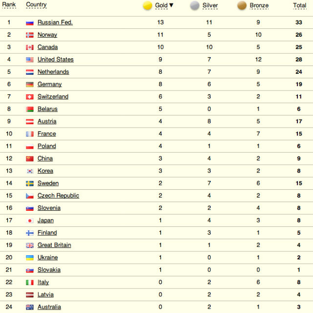 Il medagliere riporta il numero di medaglie d’oro, d’argento e di bronzo conquistate da ciascuna nazione. Le classifiche possono essere ordinate in modo diverso: il metodo più comune privilegia il numero di ori, seguito dagli argenti e dai bronzi; altre graduatorie usano il conteggio totale delle medaglie o sistemi di punteggio ponderato (ad esempio 3 punti per l’oro, 2 per l’argento, 1 per il bronzo). Ogni criterio può alterare la posizione di una nazione rispetto alle altre e suscita discussioni sul significato di ‘successo’.
