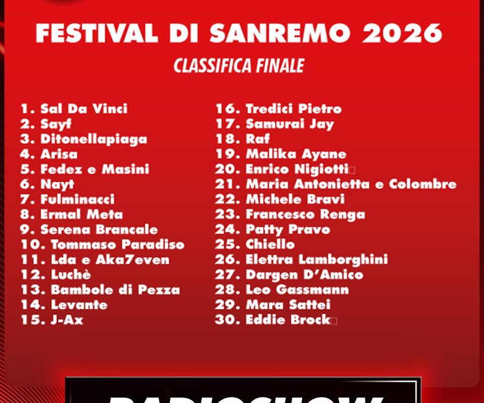 Secondo le fonti disponibili, la classifica finale del Festival di Sanremo 2026 ha visto al primo posto Sal Da Vinci con il brano “Saremo io e te”. Al secondo posto si è piazzato Sayf con “Tu mi piaci”, mentre il terzo gradino del podio è andato a Ditonellapiaga con “Che fastidio!”. Al quarto posto figura Arisa con il brano “Magica favola”.