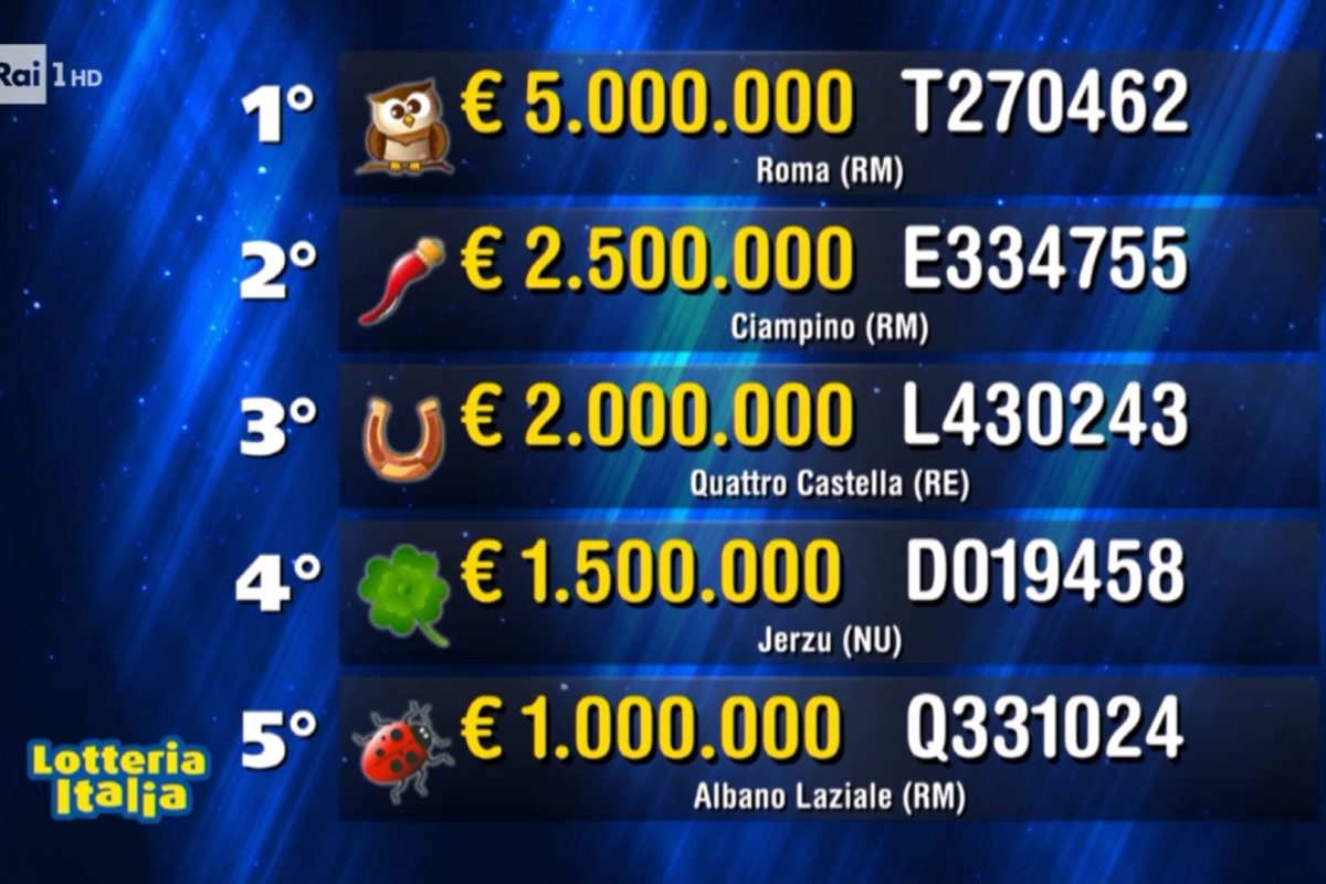 La Lotteria Italia 2026 ha assegnato il primo premio da 5 milioni di euro al biglietto numero di serie T2270462, venduto a Roma. La provincia di Roma si aggiudica anche il secondo premio, valore 2,5 milioni di euro, che va al detentore del biglietto numero di serie E334755, venduto a Ciampino. Il biglietto numero di serie L430243, abbinato al terzo premio da 2 milioni, è stato invece acquistato a Quattro Castella (Reggio Emilia). Quarto premio pari a un milione e mezzo di euro al biglietto numero di serie D019458, venduto a Jerzu (NU), mentre il quinto premio, valore 1 milione di euro, è associato al biglietto numero di serie Q331024, venduto ad Albano Laziale.