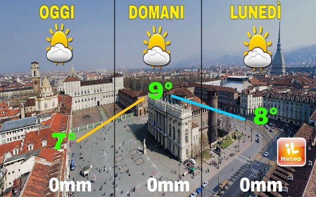 La città di Torino sta vivendo una fase caratterizzata da condizioni invernali tipiche ma particolarmente rigide. Durante la giornata di oggi la temperatura massima registrata sarà di 5°C, la minima di -3°C, lo zero termico si attesterà a 851m. I venti saranno al mattino assenti, per il resto della giornata deboli provenienti da Nord. Nonostante il sole prevalente, il contesto sarà quello di un inverno secco, con ampie schiarite, assenza di precipitazioni e temperature rigide.
